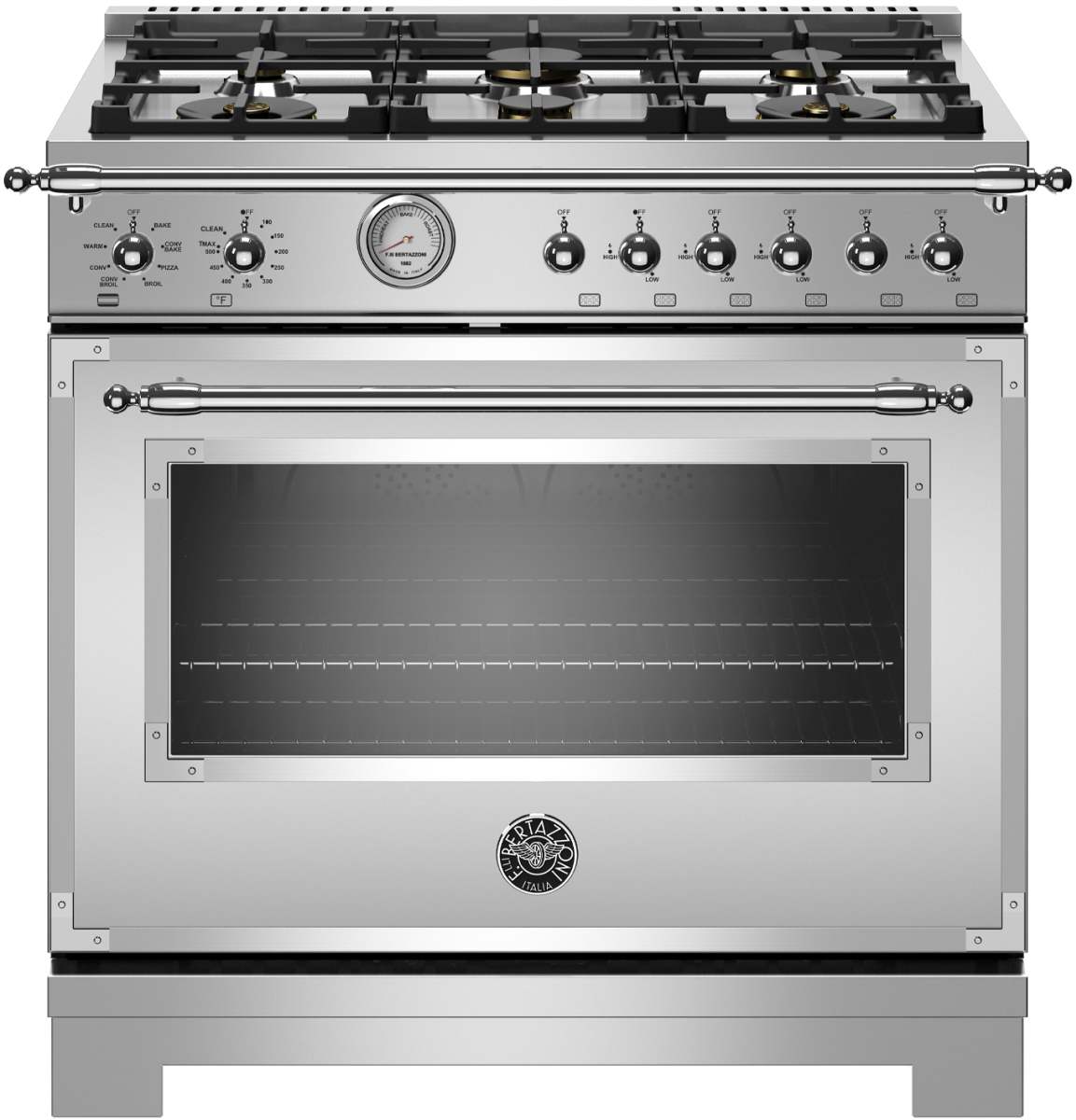 The new Bertazzoni ranges are superb cooking appliances designed, engineered and made in Italy. All Bertazzoni appliances integrate seamlessly into style-harmonized suites for a true, high-performing kitchen. The high-efficiency maintop with 6 brass burners features 2 dual ring 19,000 BTU power-burners that boil water in under 6 minutes (best in class), and 4 additional MonoBloc burners of variable size and power to suit every style of cooking, with delicate simmer at 750 BTUs. The 5.9 cubic feet oven cavity is the largest in its class, with dual convection fan for balanced airflow and even temperature baking and roasting on 7 shelf levels. The elegant large temperature gauge monitors the actual temperature in the oven. The extra wide infrared gas broiler is ideal for grilling and searing at high heat. The oven includes convenient features such as smooth telescopic glides for the oven shelves and soft-close doors. The edge-to-edge interior oven glass door maximizes interior volume and can be wiped clean without effort. All Bertazzoni appliances are covered by a 2-year warranty. Products and packaging are 99% recyclable.
