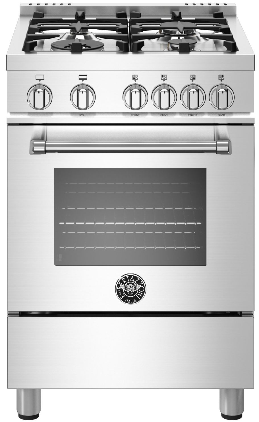 The new Bertazzoni ranges are superb cooking appliances designed, engineered and made in Italy. All Bertazzoni appliances integrate seamlessly into style-harmonized suites for a true, high-performing kitchen. The high-efficiency maintop with 4 burners features a dual ring 19,000 BTU power-burner that boils water in under 6 minutes (best in class), and 3 additional burners of variable size and power to suit every style of cooking, with delicate simmer at 750 BTUs. The 2.4 cubic feet oven cavity has a convection fan for balanced airflow and even temperature baking and roasting on multiple levels. The extra wide infrared gas broiler is ideal for grilling and searing at high heat. The large interior oven glass door maximizes interior volume and can be wiped clean without effort. All Bertazzoni appliances are covered by a 2-year warranty. Products and packaging are 99% recyclable.