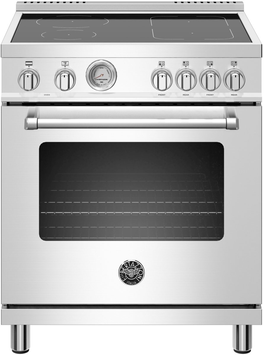 The new Bertazzoni ranges are superb cooking appliances designed, engineered and made in Italy. All Bertazzoni appliances integrate seamlessly into style-harmonized suites for a true, high-performing kitchen. This all-new induction range has 4 high-power heating zones with maximum power output of 3700W. The right-side heating zones can be bridged to create a larger cooking area. Each induction area is controlled with knobs and has a convenient read-out interface on the glass worktop. The 4.7 cubic feet oven cavity is the largest in its class, with dual convection fan for balanced airflow and even temperature baking and roasting on 7 shelf levels. The elegant large temperature gauge monitors the actual temperature in the oven. The extra wide electric broiler with optional convection is ideal for grilling and searing at high heat. The oven includes convenient soft-motion doors. The edge-to-edge interior oven glass door maximizes interior volume and can be wiped clean without effort. All Bertazzoni appliances are covered by a 2-year warranty. Products and packaging are 99% recyclable.