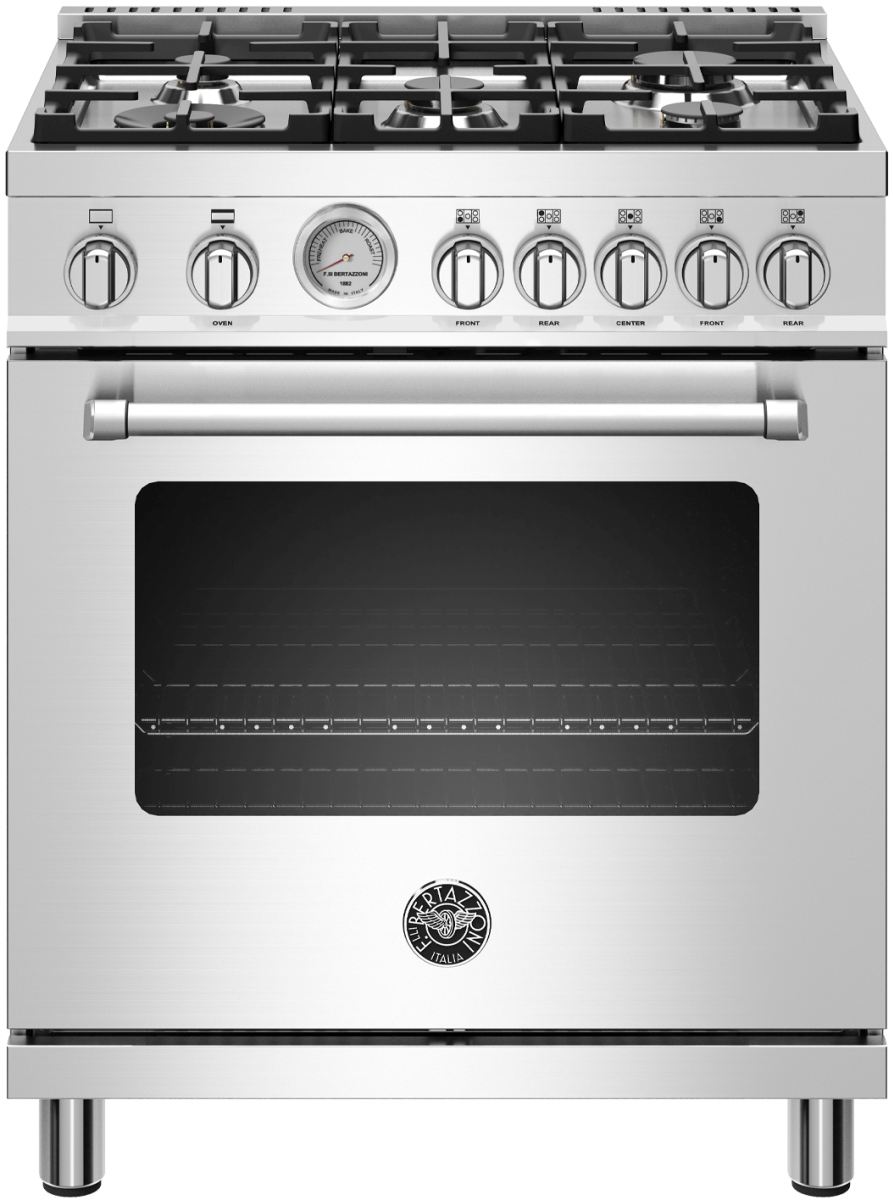 The new Bertazzoni ranges are superb cooking appliances designed, engineered and made in Italy. All Bertazzoni appliances integrate seamlessly into style-harmonized suites for a true, high-performing kitchen. The high-efficiency maintop with 5 burners features a dual ring 19,000 BTU power-burner that boils water in under 6 minutes (best in class), and 4 additional MonoBloc burners of variable size and power to suit every style of cooking, with delicate simmer at 750 BTUs. The 4.7 cubic feet oven cavity is the largest in its class, with dual convection fan for balanced airflow and even temperature baking and roasting on 7 shelf levels. The elegant large temperature gauge monitors the actual temperature in the oven. The extra wide infrared gas broiler is ideal for grilling and searing at high heat. The oven includes convenient soft-motion doors. The edge-to-edge interior oven glass door maximizes interior volume and can be wiped clean without effort. All Bertazzoni appliances are covered by a 2-year warranty. Products and packaging are 99% recyclable.