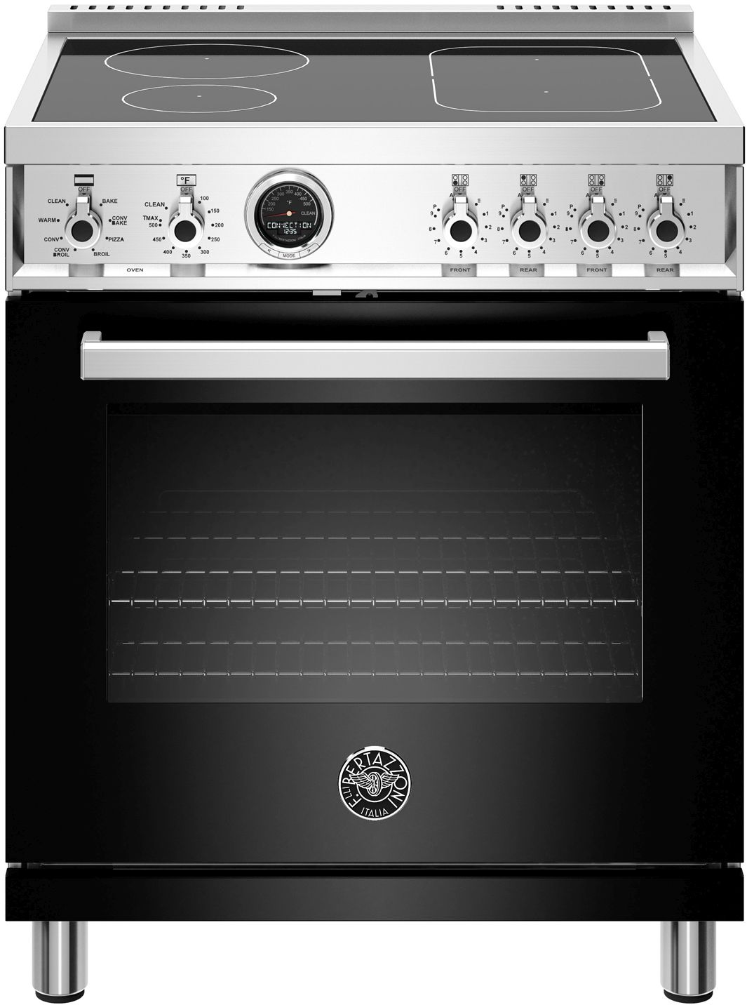 The new Bertazzoni ranges are superb cooking appliances designed, engineered and made in Italy. All Bertazzoni appliances integrate seamlessly into style-harmonized suites for a true, high-performing kitchen. This all-new induction range has 4 high-power heating zones with maximum power output of 3700W. The right-side heating zones can be bridged to create a larger cooking area. Each induction area is controlled with knobs and has a convenient read-out interface on the glass worktop. The 4.6 cubic feet oven cavity is the largest in its class, with dual convection fan for balanced airflow and even temperature baking and roasting on 7 shelf levels. The elegant digital temperature gauge monitors the actual temperature in the oven and has integrated controls in the bezel for the food temperature probe. The extra wide electric broiler with optional convection is ideal for grilling and searing at high heat. The oven includes convenient features such as smooth telescopic glides for the oven shelves and soft-close doors. The edge-to-edge interior oven glass door maximizes interior volume and can be wiped clean without effort. All Bertazzoni appliances are covered by a 2-year warranty. Products and packaging are 99% recyclable.