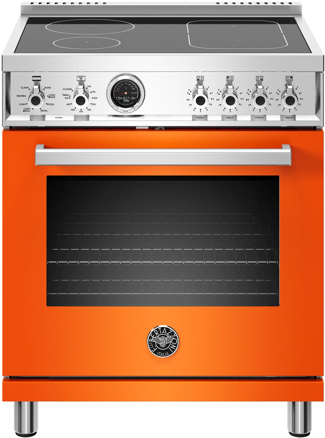 The new Bertazzoni ranges are superb cooking appliances designed, engineered and made in Italy. All Bertazzoni appliances integrate seamlessly into style-harmonized suites for a true, high-performing kitchen. This all-new induction range has 4 high-power heating zones with maximum power output of 3700W. The right-side heating zones can be bridged to create a larger cooking area. Each induction area is controlled with knobs and has a convenient read-out interface on the glass worktop. The 4.6 cubic feet oven cavity is the largest in its class, with dual convection fan for balanced airflow and even temperature baking and roasting on 7 shelf levels. The elegant digital temperature gauge monitors the actual temperature in the oven and has integrated controls in the bezel for the food temperature probe. The extra wide electric broiler with optional convection is ideal for grilling and searing at high heat. The oven includes convenient features such as smooth telescopic glides for the oven shelves and soft-close doors. The edge-to-edge interior oven glass door maximizes interior volume and can be wiped clean without effort. All Bertazzoni appliances are covered by a 2-year warranty. Products and packaging are 99% recyclable.
