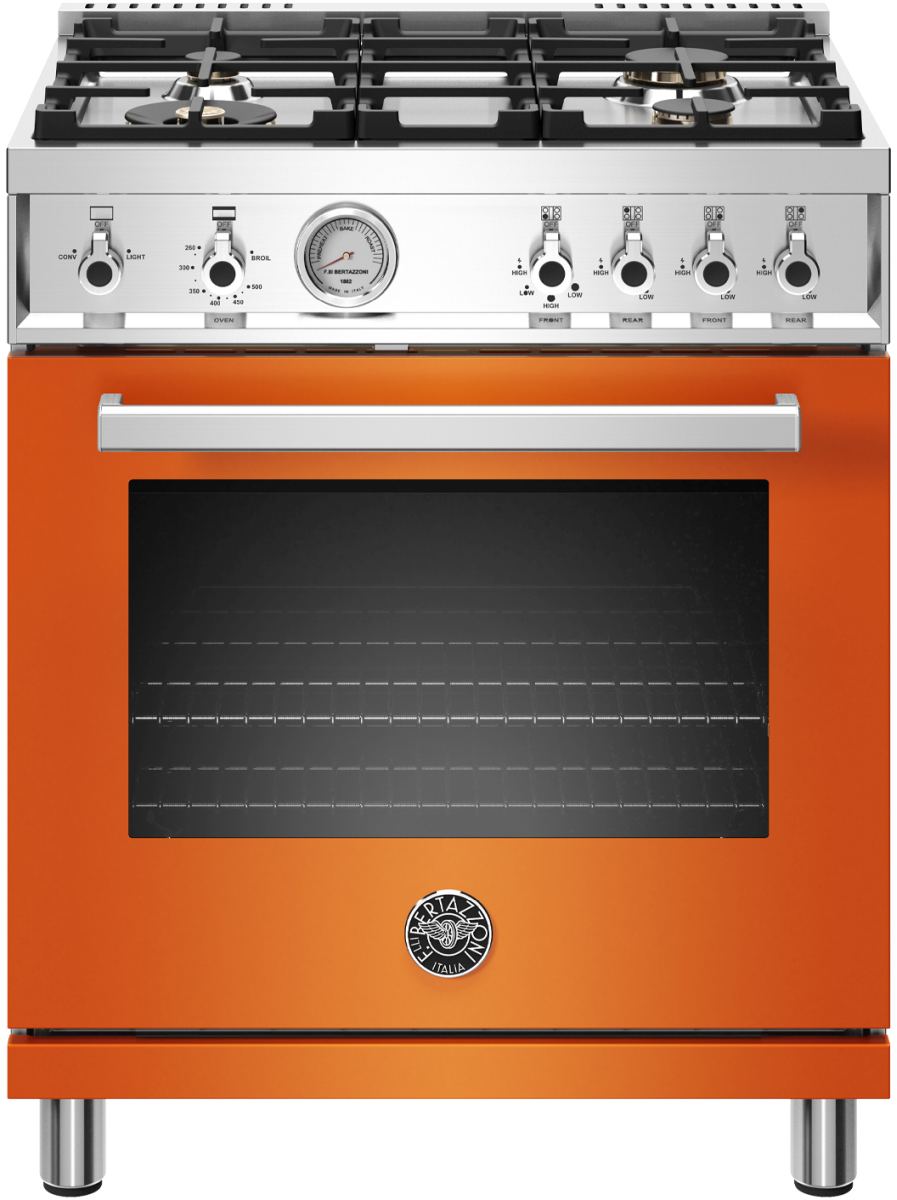 The new Bertazzoni ranges are superb cooking appliances designed, engineered and made in Italy. All Bertazzoni appliances integrate seamlessly into style-harmonized suites for a true, high-performing kitchen. The high-efficiency maintop with 4 brass burners features a dual ring 19,000 BTU power-burner that boils water in under 6 minutes (best in class), and 3 additional MonoBloc burners of variable size and power to suit every style of cooking, with delicate simmer at 750 BTUs. The 4.7 cubic feet oven cavity is the largest in its class, with dual convection fan for balanced airflow and even temperature baking and roasting on 7 shelf levels. The elegant large temperature gauge monitors the actual temperature in the oven. The extra wide infrared gas broiler is ideal for grilling and searing at high heat. The oven includes convenient features such as smooth telescopic glides for the oven shelves and soft-close doors. The edge-to-edge interior oven glass door maximizes interior volume and can be wiped clean without effort. All Bertazzoni appliances are covered by a 2-year warranty. Products and packaging are 99% recyclable.