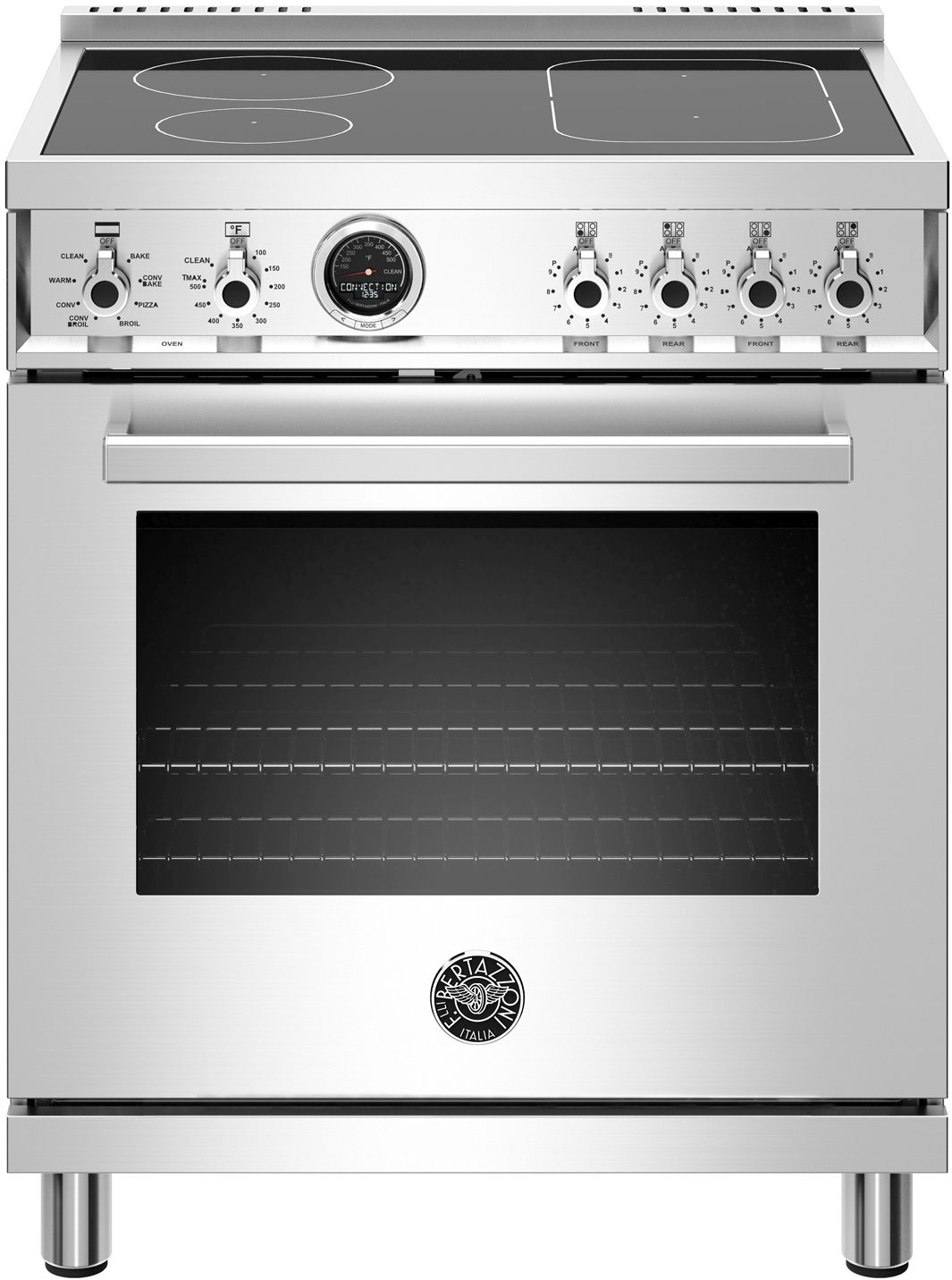 The new Bertazzoni ranges are superb cooking appliances designed, engineered and made in Italy. All Bertazzoni appliances integrate seamlessly into style-harmonized suites for a true, high-performing kitchen. This all-new induction range has 4 high-power heating zones with maximum power output of 3700W. The right-side heating zones can be bridged to create a larger cooking area. Each induction area is controlled with knobs and has a convenient read-out interface on the glass worktop. The 4.6 cubic feet oven cavity is the largest in its class, with dual convection fan for balanced airflow and even temperature baking and roasting on 7 shelf levels. The elegant digital temperature gauge monitors the actual temperature in the oven and has integrated controls in the bezel for the food temperature probe. The extra wide electric broiler with optional convection is ideal for grilling and searing at high heat. The oven includes convenient features such as smooth telescopic glides for the oven shelves and soft-close doors. The edge-to-edge interior oven glass door maximizes interior volume and can be wiped clean without effort. All Bertazzoni appliances are covered by a 2-year warranty. Products and packaging are 99% recyclable.