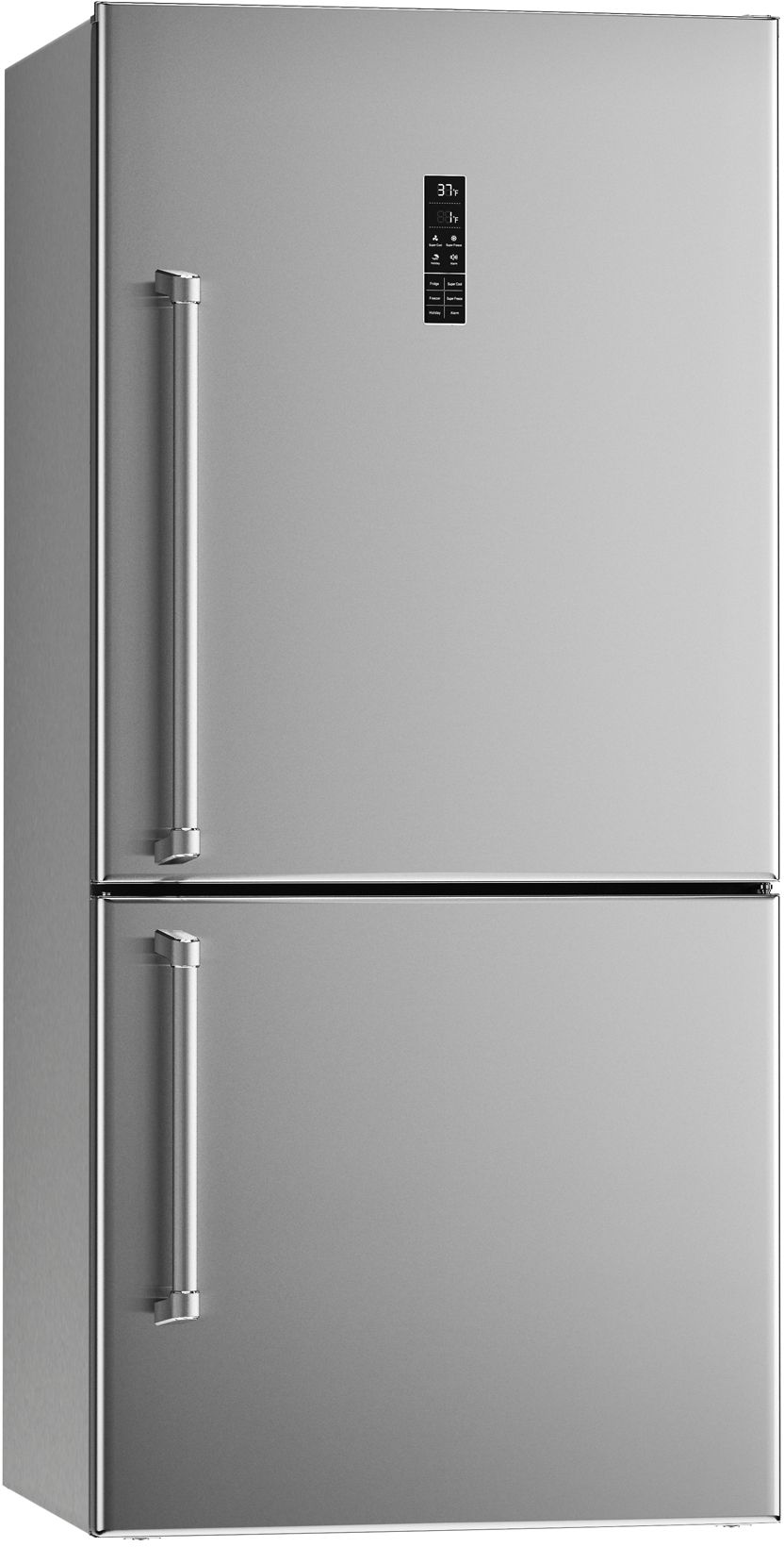 The Bertazzoni 31” stainless steel refrigerator is designed and engineered with the highest grade materials and components. Using one of the 2 available handle kits in Professional and Master Series style, this refrigerator integrates seamlessly with all other Bertazzoni appliances into style-harmonized suites for a true, high-performing kitchen. This refrigerator is Energy Star compliant. This counter-deep refrigerator has ample storage capacity, with over 12 cubic feet of refrigerator volume and 5 cubic feet of freezer. The refrigerator compartment has 4 glass shelves and a full-width crisper drawer with 2 separate compartments. The freezer compartment has 3 drawers. The No-Frost air-cooling system for the refrigerator and freezer compartments provides optimal temperature and humidity control to keep food fresher longer. The electronic touch-control LED interface simplifies setting and monitoring of all vital functions, with special one-touch functions such as Super Cool, Super Freeze and Holiday mode. Stainless steel doors have special treatment that eliminates fingerprint smudges. LED lights provide clear illumination of the interior compartments. All Bertazzoni appliances are covered by a 2-year warranty. Products and packaging are 99% recyclable.