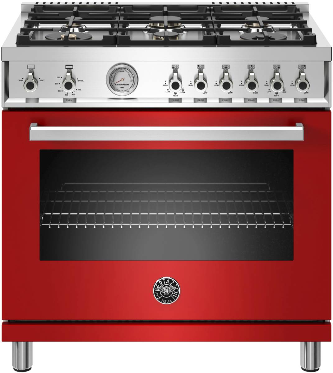 The new Bertazzoni ranges are superb cooking appliances designed, engineered and made in Italy. All Bertazzoni appliances integrate seamlessly into style-harmonized suites for a true, high-performing kitchen. The high-efficiency maintop with 6 brass burners features 2 dual ring 19,000 BTU power-burners that boil water in under 6 minutes (best in class), and 4 additional MonoBloc burners of variable size and power to suit every style of cooking, with delicate simmer at 750 BTUs. The 5.9 cubic feet oven cavity is the largest in its class, with dual convection fan for balanced airflow and even temperature baking and roasting on 7 shelf levels. The elegant large temperature gauge monitors the actual temperature in the oven. The extra wide infrared gas broiler is ideal for grilling and searing at high heat. The oven includes convenient features such as smooth telescopic glides for the oven shelves and soft-close doors. The edge-to-edge interior oven glass door maximizes interior volume and can be wiped clean without effort. All Bertazzoni appliances are covered by a 2-year warranty. Products and packaging are 99% recyclable.