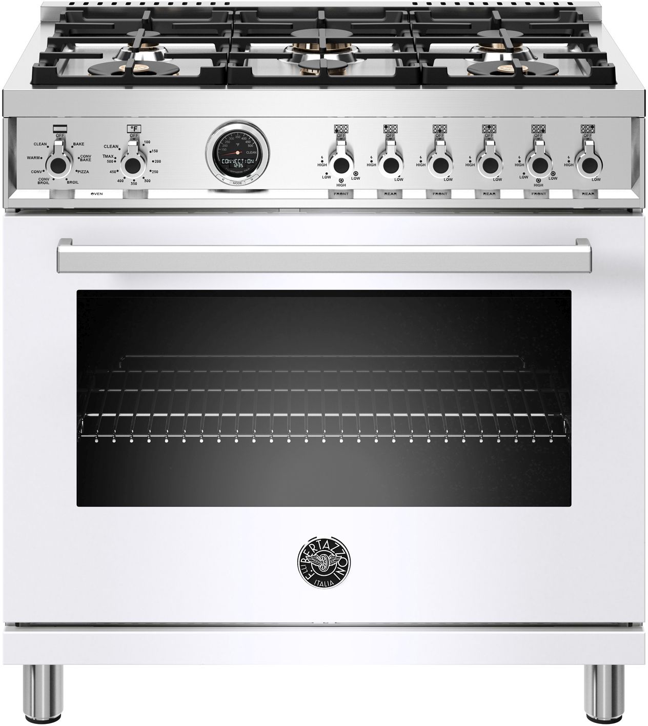 The new Bertazzoni ranges are superb cooking appliances designed, engineered and made in Italy. All Bertazzoni appliances integrate seamlessly into style-harmonized suites for a true, high-performing kitchen. The high-efficiency maintop with 6 brass burners features 2 dual ring 19,000 BTU power-burners that boil water in under 6 minutes (best in class), and 4 additional MonoBloc burners of variable size and power to suit every style of cooking, with delicate simmer at 750 BTUs. The 5.7 cubic feet self-cleaning oven is the largest in its class, with dual convection fan for balanced airflow and even temperature baking and roasting on 7 shelf levels. The elegant digital temperature gauge monitors the actual temperature in the oven and has integrated controls in the bezel for the food temperature probe. The extra wide electric broiler with optional convection is ideal for grilling and searing at high heat. The oven includes convenient features such as smooth telescopic glides for the oven shelves and soft-close doors. The edge-to-edge interior oven glass door maximizes interior volume and can be wiped clean without effort. All Bertazzoni appliances are covered by a 2-year warranty. Products and packaging are 99% recyclable.