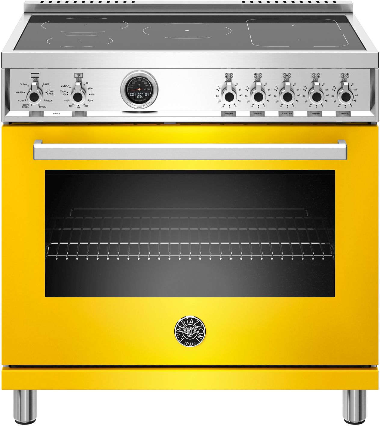 The new Bertazzoni ranges are superb cooking appliances designed, engineered and made in Italy. All Bertazzoni appliances integrate seamlessly into style-harmonized suites for a true, high-performing kitchen. This all-new induction range has 5 high-power heating zones with maximum power output of 3700W. The right-side heating zones can be bridged to create a larger cooking area. Each induction area is controlled with knobs and has a convenient read-out interface on the glass worktop. The 5.7 cubic feet self-cleaning oven is the largest in its class, with dual convection fan for balanced airflow and even temperature baking and roasting on 7 shelf levels. The elegant digital temperature gauge monitors the actual temperature in the oven and has integrated controls in the bezel for the food temperature probe. The extra wide electric broiler with optional convection is ideal for grilling and searing at high heat. The oven includes convenient features such as smooth telescopic glides for the oven shelves and soft-close doors. The edge-to-edge interior oven glass door maximizes interior volume and can be wiped clean without effort. All Bertazzoni appliances are covered by a 2-year warranty. Products and packaging are 99% recyclable.