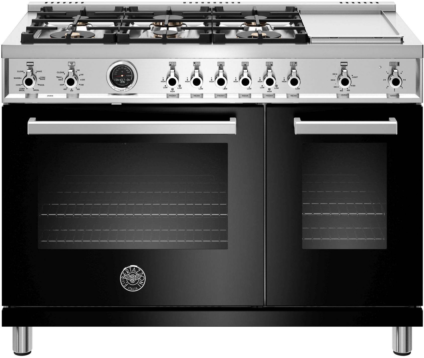 The new Bertazzoni ranges are superb cooking appliances designed, engineered and made in Italy. All Bertazzoni appliances integrate seamlessly into style-harmonized suites for a true, high-performing kitchen. The high-efficiency maintop with 6 brass burners and electric griddle features 2 dual ring 19,000 BTU power-burners that boil water in under 6 minutes (best in class), and 4 additional MonoBloc burners of variable size and power to suit every style of cooking, with delicate simmer at 750 BTUs. The stainless steel griddle with integrated cover provides additional cooking options. The 4.7 cubic feet self-cleaning oven is the largest in its class, with dual convection fan for balanced airflow and even temperature baking and roasting on 7 shelf levels. The elegant digital temperature gauge monitors the actual temperature in the oven and has integrated controls in the bezel for the food temperature probe. The extra wide electric broiler with optional convection is ideal for grilling and searing at high heat. The 2.4 cubic feet auxiliary oven is perfect for smaller dishes and for warming. Both ovens include convenient features such as smooth telescopic glides for the oven shelves and soft-close doors. The edge-to-edge interior oven glass door maximizes interior volume and can be wiped clean without effort. All Bertazzoni appliances are covered by a 2-year warranty. Products and packaging are 99% recyclable.