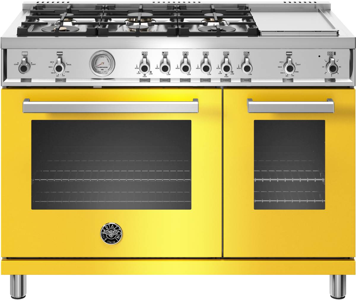 The new Bertazzoni ranges are superb cooking appliances designed, engineered and made in Italy. All Bertazzoni appliances integrate seamlessly into style-harmonized suites for a true, high-performing kitchen. The high-efficiency maintop with 6 brass burners and electric griddle features 2 dual ring 19,000 BTU power-burners that boil water in under 6 minutes (best in class), and 4 additional MonoBloc burners of variable size and power to suit every style of cooking, with delicate simmer at 750 BTUs. The stainless steel griddle with integrated cover provides additional cooking options. The 4.8 cubic feet main oven cavity is the largest in its class, with dual convection fan for balanced airflow and even temperature baking and roasting on 7 shelf levels. The elegant large temperature gauge monitors the actual temperature in the oven. The extra wide infrared gas broiler is ideal for grilling and searing at high heat. The 2.4 cubic feet auxiliary oven is perfect for smaller dishes and for warming. Both ovens include convenient features such as smooth telescopic glides for the oven shelves and soft-close doors. The edge-to-edge interior oven glass door maximizes interior volume and can be wiped clean without effort. All Bertazzoni appliances are covered by a 2-year warranty. Products and packaging are 99% recyclable.