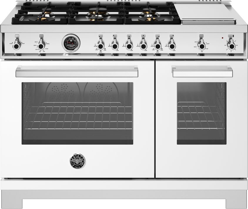 The 4.7 cu.ft gas oven with dual horizontal convection allows even baking and roasting on 7 shelf levels. A 2.4 cu.ft auxiliary oven helps prepare multiple dishes at the same time. Bertazzoni ovens are equipped with an extra-large high-power broiler for broiling and grillin