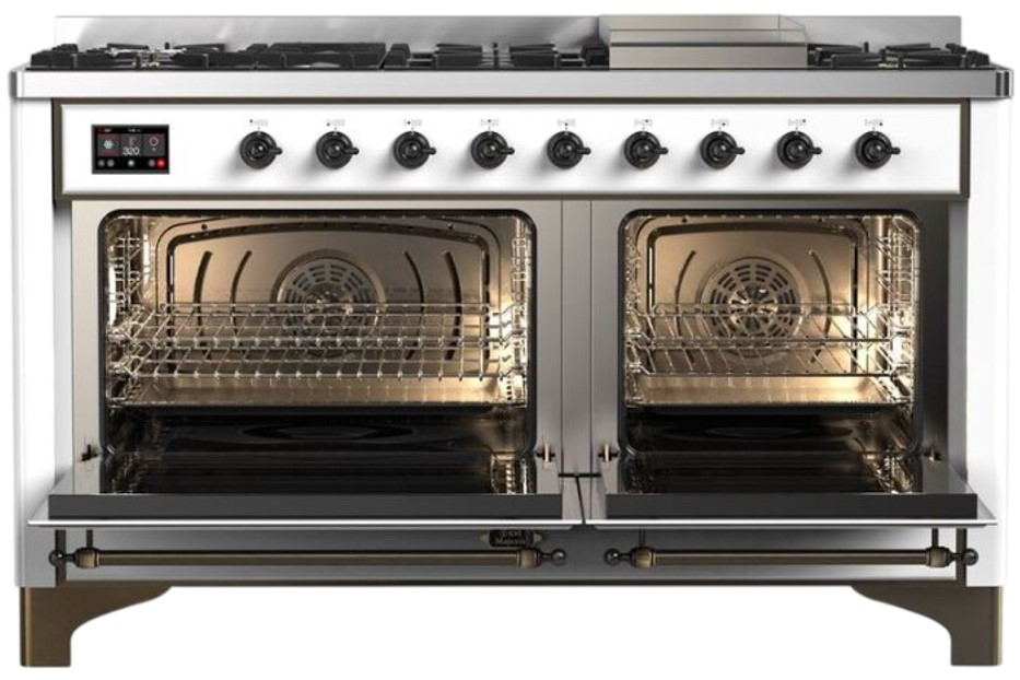 The Majestic 60" dual fuel range combines the classic Italian style and cutting-edge technology. This range feature 9 gas burners and a griddle, equipped with a total black brass flame spreader with non-stick nanotechnological coating, dual 3.5 + 2.3 cu. ft. total oven capacity, 4.3" full touch oven control display and easy clean enamel oven cavity.Read More
