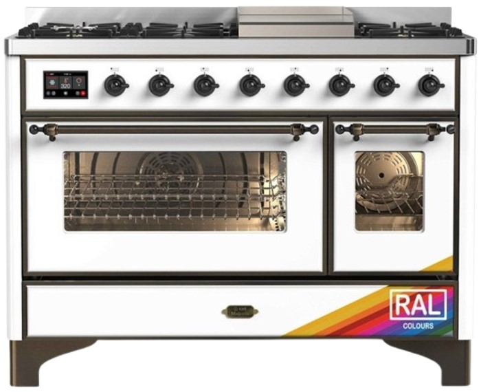 The Majestic 48" dual fuel range combines the classic Italian style and cutting-edge technology. This range features 8 gas burner and griddle, equipped with a total black brass flame spreader with non-stick nanotechnological coating, dual 3.5 + 1.52 cu. ft. total oven capacity, 4.3" full touch oven control display and easy clean enamel oven cavity.Read More