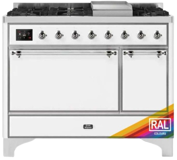 The Majestic 48" dual fuel range combines the classic Italian style and cutting-edge technology. This range features 8 gas burner and griddle, equipped with a total black brass flame spreader with non-stick nanotechnological coating, dual 3.5 + 1.52 cu. ft. total oven capacity, 4.3" full touch oven control display and easy clean enamel oven cavity.Read More
