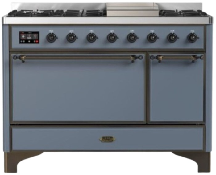 The Majestic 48" dual fuel range combines the classic Italian style and cutting-edge technology. This range features 8 gas burner and griddle, equipped with a total black brass flame spreader with non-stick nanotechnological coating, dual 3.5 + 1.52 cu. ft. total oven capacity, 4.3" full touch oven control display and easy clean enamel oven cavity.Read More