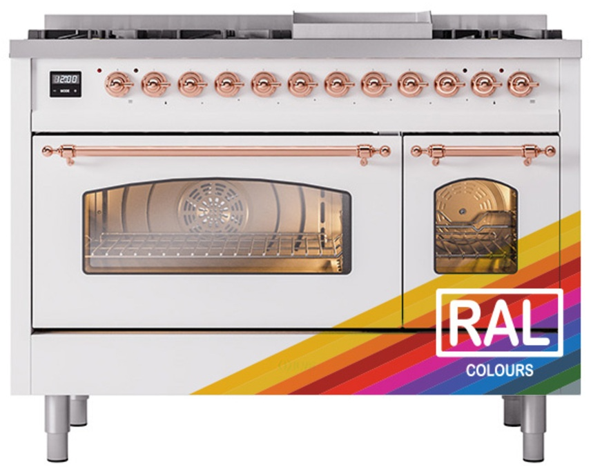 Introducing the new Nostalgie II 48" dual fuel range, a classic addition with a touch of innovation to any kitchen. This range feature sealed burners equipped with total black brass flame spreader that has a non-stick nanotechnological coating, heavy cast iron grates, 3.5 + 1.52 cu. ft. total double oven capacity and soft closing door system.Read More